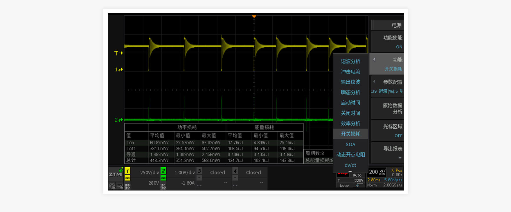 開關電源的質量直接影響到產品的技術性能以及其安全性和可靠性。電源測試項目多,計算量大,統計繁瑣等問題一直困擾著工程師們,為了解決這些問題,致遠電子在示波器中增加開關損耗、SOA、電感測試等電源分析功能。如在電感測試功能中可直接對電感、有功功率等項目進行計算,方便工程師快速、準確地測試電源產品。