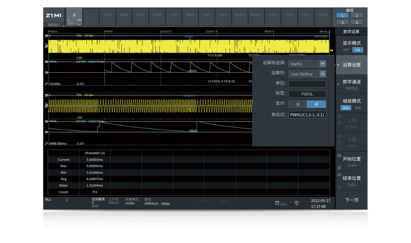 ZDL6000和ZDL5000示波記錄儀允許用戶通過自定義公式對屏幕中的波形進行數學運算,數學運算的結果將以波形方式進行呈現,用戶還可以對數學運算的波形進行二次分析。