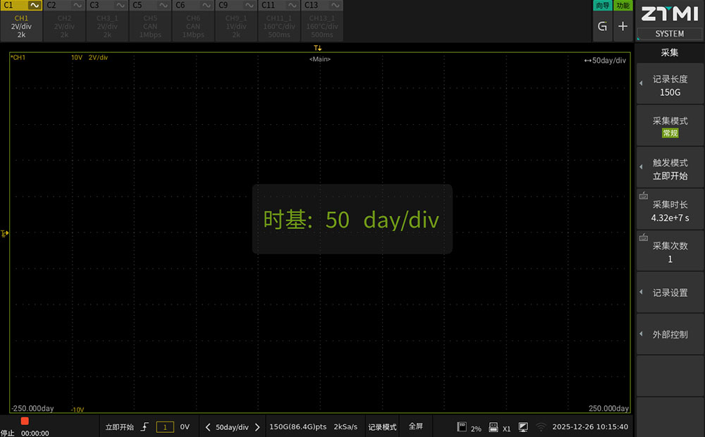 通過向右滑動界面進入記錄模式(如圖5)。在此模式下,設備啟用實時流盤技術,配合機身存儲,可實現最長500天的連續無間斷記錄。這種全數據記錄方式避免死區時間,確保存儲期間的所有信號波動均可事后追溯。