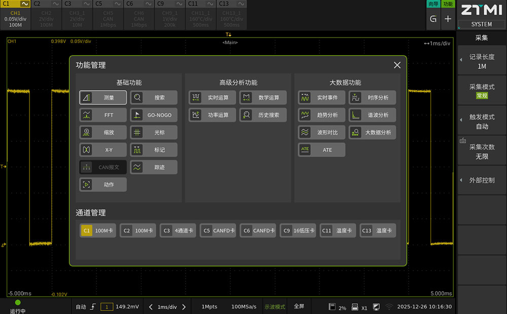 ZDL6000通過底層軟件架構的優化,實現"示波器"與"記錄儀"兩種工作模式的獨立運行。用戶通過觸屏界面的滑條即可進行功能切換,適應不同的測試階段。